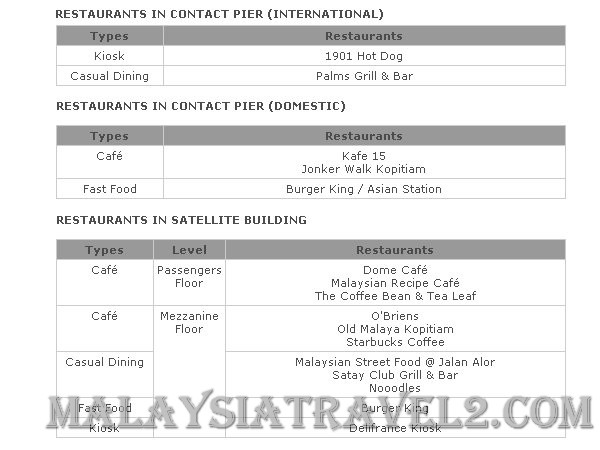 وهنا قائمة بالمطاعم و الكافيهات الموجودة في جميع ارجاء مطار كوالالمبور الدولي في ماليزيا