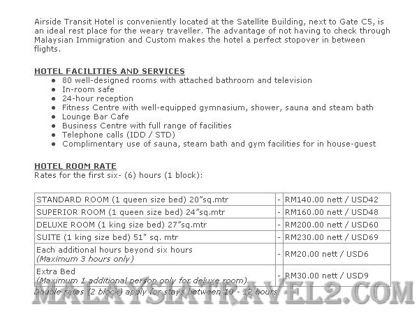 يحتوي مطار كوالالمبور الدولي على فندقين متميزين فندق داخلي مخصص للراحة والإقامة داخل المطار وخاصة لقضاء فترة الترانزيت والإنتظار الطويلة هو فندق