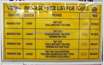 وتبدأ الاسعار من 200 رينجت للشخص حسب الوقت وبأمكانكم اخذ قارب خاص لشخصين خاصةً لمن هم في شهر العسل وتقريبا جولة ثلاث ساعات بتكلفه 350 رينجت للشخصين . يعتبر السعر قليل مقارنة بالمتعه التي سوف ترونها هناك